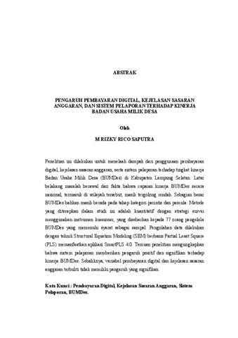 M Rizky, Rico Saputra (2025) PENGARUH PEMBAYARAN DIGITAL, KEJELASAN SASARAN ANGGARAN, DAN SISTEM PELAPORAN TERHADAP KINERJA BADAN USAHA MILIK DESA. FAKULTAS EKONOMI DAN BISNIS, UNIVERSITAS LAMPUNG.