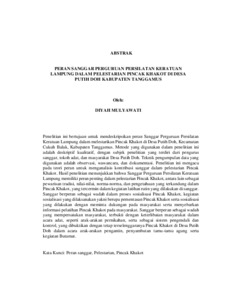 Penelitian ini bertujuan untuk mendeskripsikan peran Sanggar Perguruan Persilatan Keratuan Lampung dalam melestarikan Pincak Khakot di Desa Putih Doh, Kecamatan Cukuh Balak, Kabupaten Tanggamus. Metode yang digunakan dalam penelitian ini adalah deskriptif kualitatif, dengan subjek penelitian yang terdiri dari pengurus sanggar, tokoh adat, dan masyarakat Desa Putih Doh. Teknik pengumpulan data yang digunakan adalah observasi, wawancara, dan dokumentasi. Penelitian ini mengacu pada teori peran untuk menganalisis kontribusi sanggar dalam pelestarian Pincak Khakot. Hasil penelitian menunjukkan bahwa Sanggar Perguruan Persilatan Keratuan Lampung memiliki peran penting dalam pelestarian Pincak Khakot, antara lain sebagai pewarisan tradisi, nilai-nilai, norma-norma, dan pengetahuan yang terkandung dalam Pincak Khakot, yang tercermin dalam kegiatan latihan rutin yang dilakukan di sanggar. Sanggar berperan sebagai wadah dalam proses sosialisasi Pincak Khakot, kegiatan sosialisasi yang dilaksanakan yakni berupa pementasan Pincak Khakot serta sosialisasi yang dilakukan dengan meminta dukungan pada masyarakat serta menyebarkan informasi pelatihan Pincak Khakot pada masyarakat. Sanggar berperan sebagai wadah yang mempersatukan masyarakat, terbukti dengan keterlibatan masyarakat dalam acara adat, seperti arak-arakan pernikahan, serta sebagai sistem pengendali dan kontrol, yang dibuktikan dengan tetap terselenggaranya Pincak Khakot di Desa Putih Doh dalam acara arak-arakan pengantin, penyambutan tamu-tamu agung serta kegiatan Butamat. Kata Kunci: Peran sanggar, Pelestarian, Pincak Khakot This study aims to describe the role of Perguruan Persilatan Keratuan Lampung in preserving Pincak Khakot at Putih Doh Village, Cukuh Balak District, Tanggamus Regency. The method used in this study is descriptive qualitative, with research subjects consisting of studio administrators, traditional leaders, and the community of Putih Doh Village. Data collection techniques used are observation, interviews, and documentation. This study refers to the role theory to analyze the contribution of studios to the preservation of Pincak Khakot. The results of the study indicate that the Perguruan Persilatan Keratuan Lampung has an important role in the preservation of Pincak Khakot, including as a legacy of traditions, values, norms, and knowledge contained in Pincak Khakot, which are reflected in routine training activities carried out in the studio. The studio acts as a forum in the Pincak Khakot socialization process, the socialization activities carried out are in the form of Pincak Khakot performances and socialization carried out by asking for support from the community and disseminating information on Pincak Khakot training to the community. The studio acts as a forum that unites the community, as evidenced by the community's involvement in traditional events, such as wedding processions, and as a control and supervision system, as evidenced by the continued implementation of Pincak Khakot at Putih Doh Village in the bridal procession, welcoming distinguished guests and Butamat activities. Keywords : Studio Role, Preservation, Pincak Khakot