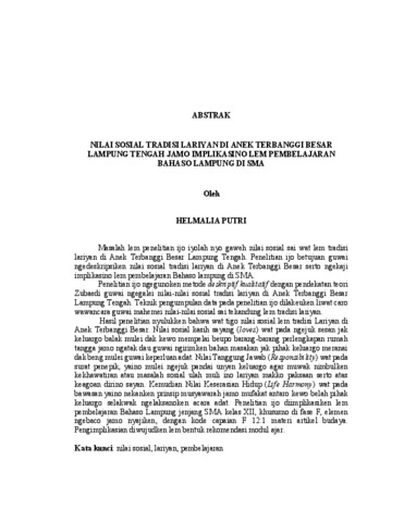 Masalah lem penelitian ijo iyolah nyo gaweh nilai sosial sai wat lem tradisi lariyan di Anek Terbanggi Besar Lampung Tengah. Penelitian ijo betujuan guwai ngedeskripsiken nilai sosial tradisi lariyan di Anek Terbanggi Besar serto ngekaji implikasino lem pembelajaran Bahaso lampung di SMA. Penelitian ijo ngegunoken metode deskriptif kualitatif dengan pendekatan teori Zubaedi guwai ngegalei nilai-nilai sosial tradisi lariyan di Anek Terbanggi Besar Lampung Tengah. Teknik pengumpulan data pada penelitian ijo dilakeuken liwat caro wawancara guwai mahemei nilai-nilai sosial sai tekandung lem tradisi lariyan. Hasil penelitian nyulukken bahwa wat tigo nilai sosial lem tradisi Lariyan di Anek Terbanggi Besar. Nilai sosial kasih sayang (loves) wat pada ngejuk sesan jak keluargo balak mulei dak kewo mempelai beupo barang-barang perlengkapan rumah tangga jamo ngatak dau guwai ngirimken bahan masakan jak pihak keluargo meranai dak beng mulei guwai keperluan adat. Nilai Tanggung Jawab (Responsibility) wat pada surat penepik, yaino mulei ngejuk pandai unyen keluargo agar muwak nimbulken kekhawatiran atau masalah sosial ulah muli ino lariyan makko paksaan serto atas keagoan dirino sayan. Kemudian Nilai Keserasian Hidup (Life Harmony) wat pada bawasan yaino nekanken prinsip musyawarah jamo mufakat antaro kewo belah pihak keluargo selakwak ngelaksanoken acara adat. Penelitian ijo diimplikasiken lem pembelajaran Bahaso Lampung jenjang SMA kelas XII, khususno di fase F, elemen ngebaco jamo nyajiken, dengan kode capaian F 12.1 materi artikel budaya. Pengimplikasian diwujudken lem bentuk rekomendasi modul ajar. Kata kunci: nilai sosial, lariyan, pembelajaran