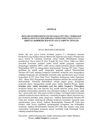 Jambu biji atau guava kristal (Psidium guajava L.) merupakan tanaman hortikultura yang buahnya banyak dikenal dan digemari masyarakat. Produktivitas guava kristal di Lampung tergolong cukup rendah dibandingkan dengan produktivitas Guava kristal di Jawa Tengah dan Jawa Timur. Salah satu faktor penyebab penurunan produksi jambu kristal adalah gangguan organisme pengganggu tumbuhan (OPT), salah satunya adalah nematoda parasit tumbuhan. Pengendalian OPT ini menggunakan bionematisida Netamax-FP Unila. Tujuan penelitian ini adalah untuk mengetahui pengaruh aplikasi Bionematisida Netamax-FP Unila terhadap komposisi komunitas nematoda serta pengaruhnya terhadap keragaman dan kelimpahan nematoda pada agroekosistem guava kristal berproduksi di PT Great Giant Food. Penelitian berlangsung bulan September 2023 - Maret 2024. Pengamatan nematoda dilakukan sebelum dan setelah aplikasi bionematisida. Nematoda diidentifikasi sampai tingkat genus. Keragaman nematoda diukur menggunakan jumlah genus, indeks Shannon-Wiener, indeks kekayaan jenis, indeks kemerataan jenis dan indeks Simpson’s. Kelimpahan nematoda diukur dari total individu dan jumlah individu setiap genus. Hasil penelitian menunjukkan nematoda yang ditemukan meliputi 16 genus pada tanah dan 7 genus pada akar. Dari genus tersebut terdapat 3 kelompok peran nematoda meliputi nematoda parasit (herbivore), nematoda pemakan bakteri (bacteriovore) dan nematoda pemakan jamur (fungivore). Aplikasi Bionematisida Netamax-FP Unila plus kompos berpengaruh terhadap komposisi komunitas nematoda pada agroekosistem guava kristal. Aplikasi Bionematisida Netamax-FP Unila plus kompos tidak secara signifikan mempengaruhi keragaman dan kelimpahan nematoda. Aplikasi Bionematisida Netamax-FP Unila plus kompos yang dapat menurunkan kelimpahan nematoda parasit tumbuhan tidak berdampak buruk terhadap nematoda hidup bebas. Kata kunci : indeks kekayaan jenis, indeks kemerataan jenis, indeks Shannon- Wiener, indeks Simpson’s, nematoda Crystal guava (Psidium guajava L.) is a horticultural plant whose fruit is widely known and as a favorable fruit in Indonesia. Crystal guava productivity in Lampung is relatively low compared to crystal guava productivity in Central Java and East Java. One of the factors causing a decline in crystal guava production is plant pest attacking, one of which is plant-parasitic nematodes. Control of these plant pests uses the bionematicide Netamax-FP UNILA. The aim of this study was to determine the effect of the application of the Netamax-FP UNILA bionematicide on the composition of the nematode community and its effect on the diversity and abundance of nematodes in the crystal guava at PT Great Giant Food. The research is conducted from September 2023 - March 2024. Nematode observations were carried out before and after bionematicide application. Nematodes were identified to the genera taxonomic level. Nematode diversity was measured using the number of genera, funtional group, Shannon-Wiener index, species richness index, species evenness index and Simpson's index. Nematode abundance was measured from the number of individuals of each genus. The research results showed that the nematodes found included 16 genera in soils and 7 genera in roots. From this genus there are 3 functional groups of nematode including parasitic nematodes (herbivores), bacterial feeder nematodes (bacterivores) and fungal feeder nematodes (fungivores). The application of the Netamax-FP UNILA bionematicide plus compost which can reduce the abundance of plant parasitic nematodesdoes not have a negative impact on freeliving nematodes and nematodes diversity. Keywords: nematodes, Shannon-Wiener index, Simpson's index, species evenness index, species richness index