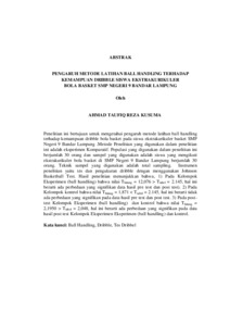 Penelitian ini bertujuan untuk mengetahui pengaruh metode latihan ball handling terhadap kemampuan dribble bola basket pada siswa ekstrakurikuler basket SMP Negeri 9 Bandar Lampung .Metode Penelitian yang digunakan dalam penelitian ini adalah eksperimen Komparatif. Populasi yang digunakan dalam penelitian ini berjumlah 30 orang dan sampel yang digunakan adalah siswa yang mengikuti ekstrakurikuler bola basket di SMP Negeri 9 Bandar Lampung berjumlah 30 orang. Teknik sampel yang digunakan adalah total sampling. Instrumen penelitian yaitu tes dan pengukuran dribble dengan menggunakan Johnson Basketball Test. Hasil penelitian menunjukkan bahwa, 1) Pada Kelompok Eksperimen (ball handling) bahwa nilai Thitung = 12,076 > Ttabel = 2.145, hal ini berarti ada perbedaan yang signifikan data hasil pre test dan post test). 2) Pada Kelompok kontrol bahwa nilai Thitung = 1,871 < Ttabel = 2.145, hal ini berarti tidak ada perbedaan yang signifikan pada data hasil pre test dan post test. 3) Pada posttest Kelompok Eksperimen (ball handling) dan kontrol bahwa nilai Thitung = 2,1950 > Ttabel = 2,048, hal ini berarti ada perbedaan yang signifikan pada data hasil post test Kelompok Eksperimen Eksperimen (ball handling) dan kontrol. Kata kunci: Ball Handling, Dribble, Tes Dribbel This study aims to determine the effect of ball handling training methods on basketball dribbling skills in extracurricular basketball students at SMP Negeri 9 Bandar Lampung. The research method used in this study is a comparative experiment. The population used in this study was 30 people and the sample used was students who participated in extracurricular basketball at SMP Negeri 9 Bandar Lampung totaling 30 people. The sampling technique used was total sampling. The research instrument was a test and dribble measurement using the Johnson Basketball Test. The results showed that, 1) In the Experimental Group (ball handling) that the Tcount value = 12.076> Ttable = 2.145, this means there is a significant difference in the pre-test and post-test data). 2) In the Control Group that the Tcount value = 1.871 <Ttable = 2.145, this means there is no significant difference in the pre-test and post-test data. 3) In the post-test of the Experimental Group (ball handling) and the control group, the T-count value = 2.1950 > T-table = 2.048, this means that there is a significant difference in the post-test data of the Experimental Group (ball handling) and the control group. Keywords: Ball Handling, Dribble, Dribble Test
