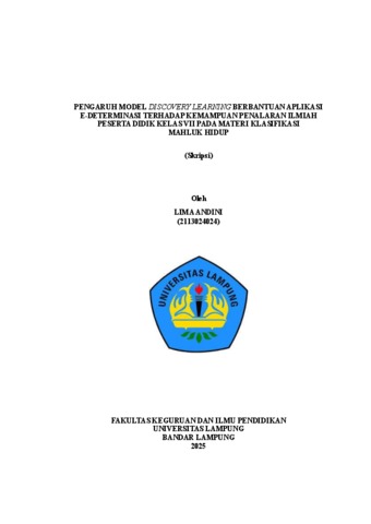 Lima, Andini (2025) PENGARUH MODEL DISCOVERY LEARNINGBERBANTUAN APLIKASI E-DETERMINASI TERHADAP KEMAMPUAN PENALARAN ILMIAH PADA MATERI KLASIFIKASI MAHLUK HIDUP. FAKULTAS KEGURUAN DAN ILMU PENDIDIKAN, UNIVERSITAS LAMPUNG.
