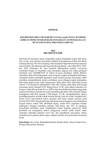 Sau San , Lu’luah (2025) KELIMPAHAN RELATIF BABI HUTAN (Sus scrofa) PASCA PANDEMI AFRICAN SWINE FEVER DI BLOK INTI KESATUAN PENGELOLAAN HUTAN BATUTEGI, PROVINSI LAMPUNG. FAKULTAS PERTANIAN, UNIVERSITAS LAMPUNG.