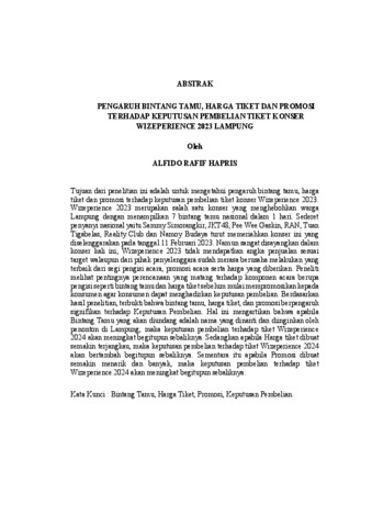 ALFIDO , RAFIF HAPRIS (2025) PENGARUH BINTANG TAMU, HARGA TIKET DAN PROMOSI TERHADAP KEPUTUSAN PEMBELIAN TIKET KONSER WIZEPERIENCE 2023 LAMPUNG. FAKULTAS EKONOMI DAN BISNIS, UNIVERSITAS LAMPUNG.
