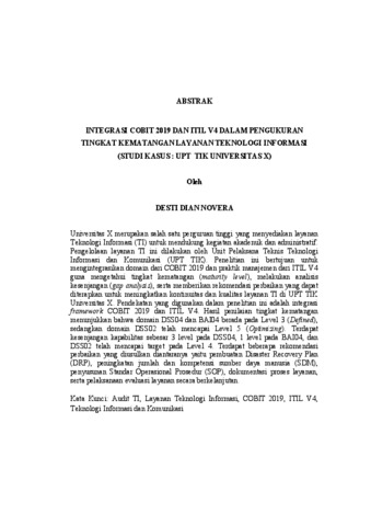 ABSTRAK Universitas X merupakan salah satu perguruan tinggi yang menyediakan layanan Teknologi Informasi (TI) untuk mendukung kegiatan akademik dan administratif. Pengelolaan layanan TI ini dilakukan oleh Unit Pelaksana Teknis Teknologi Informasi dan Komunikasi (UPT TIK). Penelitian ini bertujuan untuk mengintegrasikan domain dari COBIT 2019 dan praktik manajemen dari ITIL V4 guna mengetahui tingkat kematangan (maturity level), melakukan analisis kesenjangan (gap analysis), serta memberikan rekomendasi perbaikan yang dapat diterapkan untuk meningkatkan kontinuitas dan kualitas layanan TI di UPT TIK Universitas X. Pendekatan yang digunakan dalam penelitian ini adalah integrasi framework COBIT 2019 dan ITIL V4. Hasil penilaian tingkat kematangan menunjukkan bahwa domain DSS04 dan BAI04 berada pada Level 3 (Defined), sedangkan domain DSS02 telah mencapai Level 5 (Optimizing). Terdapat kesenjangan kapabilitas sebesar 3 level pada DSS04, 1 level pada BAI04, dan DSS02 telah mencapai target pada Level 4. Terdapat beberapa rekomendasi perbaikan yang diusulkan diantaranya yaitu pembuatan Disaster Recovery Plan (DRP), peningkatan jumlah dan kompetensi sumber daya manusia (SDM), penyusunan Standar Operasional Prosedur (SOP), dokumentasi proses layanan, serta pelaksanaan evaluasi layanan secara berkelanjutan. Kata Kunci: Audit TI, Layanan Teknologi Informasi, COBIT 2019, ITIL V4, Teknologi Informasi dan Komunikasi ABSTRACT Universitas X is one of the higher education institutions that provides Information Technology (IT) services to support academic and administrative activities. The management of these IT services is handled by the Technical Implementation Unit for Information and Communication Technology (UPT TIK). This study aims to integrate the COBIT 2019 framework domains with ITIL V4 management practices to assess the maturity level, conduct a gap analysis, and provide improvement recommendations that can enhance the continuity and quality of IT services at UPT TIK, Universitas X. The approach used in this research is the integration of COBIT 2019 and ITIL V4 frameworks. The maturity level assessment results indicate that the DSS04 and BAI04 domains are at Level 3 (Defined), while the DSS02 domain has reached Level 5 (Optimizing). There is a capability gap of three levels in DSS04, one level in BAI04, while DSS02 has achieved the target at Level 4. Several improvement recommendations include the development of a Disaster Recovery Plan (DRP), increasing the number and competence of human resources, preparing Standard Operating Procedures (SOP), documenting service processes, and conducting continuous service evaluations. Keywords: IT Audit, Information Technology Services, COBIT 2019, ITIL V4, Information and Communication Technology
