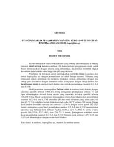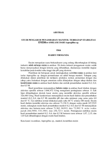 ABSTRAK Enzim merupakan suatu biokatalisator yang sedang dikembangkan di bidang industri, salah satunya enzim α-amilase. Di dunia industri penggunaan enzim sudah harus menyesuaikan dengan kriteria yang dibutuhkan, diantaranya memiliki tingkat kestabilan pada kondisi suhu tinggi dan pH yang ekstrem. Penelitian ini bertujuan untuk meningkatkan stabilitas enzim α-amilase dari isolat Aspergillus sp. dengan pemanfaatan zat aditif berupa manitol. Tahapan yang dilakukan dalam penelitian ini meliputi; produksi, isolasi, pemurnian dengan dua tahap yaitu fraksinasi dengan amonium sulfat dilanjutkan dengan tahap dialisis dan karakterisasi enzim α-amilase hasil dialisis dan setelah penambahan manitol 0,2; 0,4; dan 0,5 M. Hasil penelitian menunjukkan bahwa enzim α-amilase hasil dialisis dengan aktivitas spesifik sebesar 3.846,472 U/mg mengalami peningkatan sebesar 11 kali lipat dibandingkan ekstrak kasar enzim yang memiliki aktivitas spesifik sebesar 326,448 U/mg. Hasil karakterisasi menunjukkan enzim hasil dialisis dan penambahan manitol (0,2; 0,4; dan 0,5 M) memiliki pH dan suhu optimum yang sama yaitu 4,0 dan 65 °C. Uji stabilitas termal dilakukan pada suhu 60 °C selama 100 menit. Enzim hasil dialisis memiliki aktivitas sisa sebesar 71,336 % dengan waktu paruh 247,5525 menit, sedangkan enzim hasil penambahan manitol 0,2; 0,4; dan 0,5 M menunjukkan aktivitas sisa berturut-turut sebesar 71,362; 84,912; dan 72,902 % serta waktu paruh 266,5950; 533,1901; dan 256,7211 menit. Peningkatan stabilitas enzim hasil penambahan manitol 0,2; 0,4; dan 0,5 M berturut-turut sebesar 1,07; 2,15; dan 1,03 kali dibandingkan dengan enzim hasil dialisis. Kata kunci: α-amilase, Aspergillus sp., manitol, kestabilan enzim ABSTRACT Enzymes are biocatalysts currently being developed in industry, one of which is α-amylase. In the industrial world, enzymes must meet specific requirements, including stability at high temperatures and extreme pH. This study aims to improve the stability of the α-amylase enzyme from Aspergillus sp. isolates by utilizing mannitol as an additive. The stages carried out in this study include production, isolation, and purification in two stages: fractionation with ammonium sulfate followed by dialysis and characterization of the α-amylase enzyme resulting from dialysis and after the addition of 0.2, 0.4, and 0.5 M mannitol. The results of the study showed that the α-amylase enzyme from dialysis with a specific activity of 3,846.472 U/mg experienced an 11-fold increase compared to the crude enzyme extract which had a specific activity of 326.448 U/mg. The characterization results showed that the enzyme from dialysis and the addition of mannitol (0.2; 0.4; and 0.5 M) had the same optimum pH and temperature, namely 4.0 and 65 °C. Thermal stability test was conducted at 60 °C for 100 minutes. The dialyzed enzyme had a residual activity of 71.336 % with a half-life of 247.5525 minutes, while the enzyme with the addition of 0.2; 0.4; and 0.5 M mannitol showed a residual activity of 71.362; 84.912; and 72.902 %, respectively, and a half-life of 266.5950; 533.1901; and 256.7211 minutes. The increase in enzyme stability from the addition of 0.2; 0.4; and 0.5 M mannitol was 1.07; 2.15; and 1.03 times, respectively, compared to the dialyzed enzyme. Keywords: α-amylase, Aspergillus sp., mannitol, enzyme stability