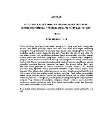 RINA , MANGGALANI (2025) PENGARUH BAURAN KOMUNIKASI PEMASARAN TERHADAP KEPUTUSAN PEMBELIAN PRODUK ASURANSI PANIN DAI-ICHI LIFE. Masters thesis, UNIVERSITAS LAMPUNG.