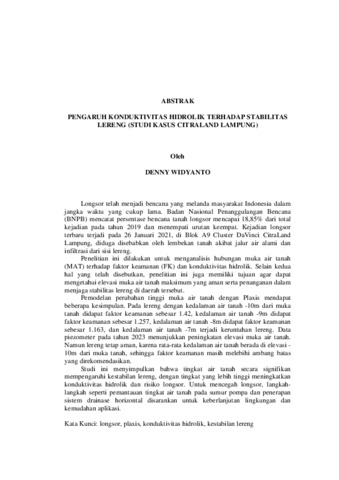 ABSTRAK Longsor telah menjadi bencana yang melanda masyarakat Indonesia dalam jangka waktu yang cukup lama. Badan Nasional Penanggulangan Bencana (BNPB) mencatat persentase bencana tanah longsor mencapai 18,85% dari total kejadian pada tahun 2019 dan menempati urutan keempat. Kejadian longsor terbaru terjadi pada 26 Januari 2021, di Blok A9 Cluster DaVinci CitraLand Lampung, diduga disebabkan oleh lembekan tanah akibat jalur air alami dan infiltrasi dari sisi lereng. Penelitian ini dilakukan untuk menganalisis hubungan muka air tanah (MAT) terhadap faktor keamanan (FK) dan konduktivitas hidrolik. Selain kedua hal yang telah disebutkan, penelitian ini juga memiliki tujuan agar dapat mengetahui elevasi muka air tanah maksimum yang aman serta penanganan dalam menjaga stabilitas lereng di daerah tersebut. Pemodelan perubahan tinggi muka air tanah dengan Plaxis mendapat beberapa kesimpulan. Pada lereng dengan kedalaman air tanah -10m dari muka tanah didapat faktor keamanan sebesar 1.42, kedalaman air tanah -9m didapat faktor keamanan sebesar 1.257, kedalaman air tanah -8m didapat faktor keamanan sebesar 1.163, dan kedalaman air tanah -7m terjadi keruntuhan lereng. Data piezometer pada tahun 2023 menunjukkan peningkatan elevasi muka air tanah. Namun lereng tetap aman, karena rata-rata kedalaman air tanah berada di elevasi - 10m dari muka tanah, sehingga faktor keamanan masih melebihi ambang batas yang direkomendasikan. Studi ini menyimpulkan bahwa tingkat air tanah secara signifikan mempengaruhi kestabilan lereng, dengan tingkat yang lebih tinggi meningkatkan konduktivitas hidrolik dan risiko longsor. Untuk mencegah longsor, langkah- langkah seperti pemantauan tingkat air tanah pada sumur pompa dan penerapan sistem drainase horizontal disarankan untuk keberlanjutan lingkungan dan kemudahan aplikasi. Kata Kunci: longsor, plaxis, konduktivitas hidrolik, kestabilan lereng i ABSTRACT Landslides represent a recurring geohazard affecting numerous regions across Indonesia. According to the Indonesian National Disaster Management Agency (BNPB), landslides accounted for 18.85% of all disaster events in 2019, ranking fourth in frequency. A notable incident occurred on January 26, 2021, at Block A9, DaVinci Cluster, CitraLand Lampung. The event was presumed to be triggered by soil softening due to natural water pathways and infiltration along the slope. This study investigates the influence of the groundwater table (GWT) on the slope’s safety factor (SF) and hydraulic conductivity. The objectives include determining the maximum allowable groundwater elevation to maintain slope stability and proposing effective mitigation strategies. Numerical modeling was performed using PLAXIS to simulate changes in groundwater elevation. The simulation results indicate that a GWT at −10 m from the ground surface yields a SF of 1.42. A GWT at −9 m results in a SF of 1.257, while at −8 m the SF drops to 1.163. Slope failure occurs at −7 m depth. Piezometric data from 2023 show a rising GWT; however, the slope remains stable, as the average groundwater depth remains around −10 m, keeping the SF above the recommended safety threshold. This study finds that groundwater fluctuations significantly impact slope stability. Higher groundwater elevations increase hydraulic conductivity and, consequently, the potential for slope failure. To mitigate landslide risks, this study recommends continuous groundwater monitoring through observation wells and the implementation of horizontal drainage systems. These strategies are essential for ensuring slope stability and enhancing long-term environmental sustainability. Keywords: landslides, plaxis, hydraulic conductivity, slope stability
