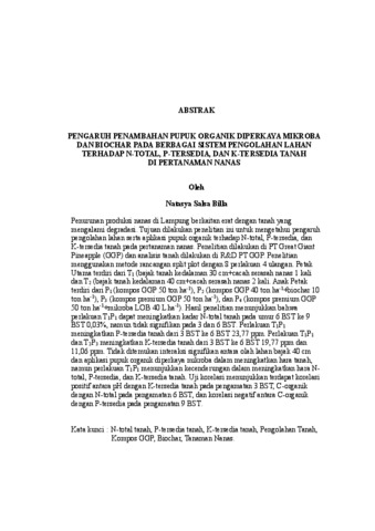 NATASYA SALSA , BILLA (2025) PENGARUH PENAMBAHAN PUPUK ORGANIK DIPERKAYA MIKROBA DAN BIOCHAR PADA BERBAGAI SISTEM PENGOLAHAN LAHAN TERHADAP N-TOTAL, P-TERSEDIA, DAN K-TERSEDIA TANAH DI PERTANAMAN NANAS. FAKULTAS PERTANIAN, UNIVERSITAS LAMPUNG.