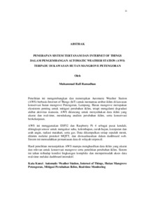 Penelitian ini mengembangkan dan menerapkan Automatic Weather Station (AWS) berbasis Internet of Things (IoT) untuk memantau atribut iklim di kawasan konservasi hutan mangrove Petengoran, Lampung. Hutan mangrove merupakan ekosistem penting untuk mitigasi perubahan iklim, tetapi mengalami degradasi akibat aktivitas manusia. AWS dirancang untuk menyediakan data iklim yang akurat dan real-time, mendukung analisis perubahan iklim, serta konservasi berkelanjutan. AWS ini menggunakan ESP32 dan Raspberry Pi 4 sebagai pusat kendali, dilengkapi sensor untuk mengukur suhu, kelembapan, curah hujan, kecepatan dan arah angin, radiasi matahari, serta gas. Data dikumpulkan setiap sepuluh menit, dikirim melalui protokol MQTT, dan divisualisasikan dalam dashboard web. Sistem ini memudahkan pemantauan data di wilayah terpencil. Hasil penelitian menunjukkan AWS mampu menghasilkan data iklim yang akurat dan relevan untuk konservasi mangrove serta penelitian perubahan iklim. Sistem ini tahan terhadap kondisi lingkungan kompleks dan mempermudah akses data real-time melalui dashboard interaktif. Kata Kunci: Automatic Weather Station, Internet of Things, Hutan Mangrove Petengoran, Mitigasi Perubahan Iklim, Real-time Monitoring This study presents the development and implementation of an Internet of Things (IoT)-based Automatic Weather Station (AWS) for monitoring climate attributes in the Petengoran mangrove forest conservation area, Lampung. As vital ecosystems for climate change mitigation, mangrove forests are increasingly threatened by anthropogenic pressures. The proposed AWS aims to deliver accurate, real-time climate data to support environmental analysis and sustainable conservation efforts. The system integrates ESP32 and Raspberry Pi 4 as control units and is equipped with sensors to measure temperature, humidity, rainfall, wind speed and direction, solar radiation, and gas concentrations. Data is collected at ten minutes interval, transmitted via MQTT protocol, and visualized through a web-based dashboard, enabling efficient and remote environmental monitoring. in remote areas. Results show that the AWS provides reliable and precise climate data, proving its suitability for mangrove conservation and climate-related research. The system is robust under complex environmental conditions and facilitates real-time data access through an interactive and user-friendly interface. Keywords: Automatic Weather Station, Internet of Things, Petengoran Mangrove Forest, Climate Change Mitigation, Real-Time Monitoring