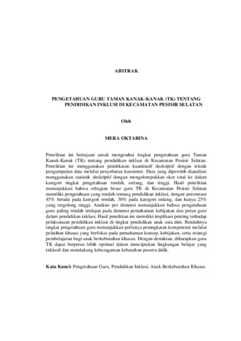 Mera , Oktarina (2025) PENGETAHUAN GURU TAMAN KANAK-KANAK ( TK ) TENTANG PENDIDIKAN INKLUSI DI KECAMATAN PESISIR SELATAN. FAKULTAS KEGURUAN DAN ILMU PENDIDIKAN, UNIVERSITAS LAMPUNG.