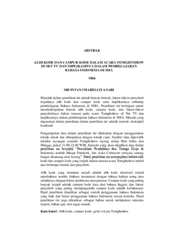 SRI INTAN CHARELLIYA SARI , - (2025) ALIH KODE DAN CAMPUR KODE DALAM ACARA TONIGHTSHOW DI NET TV DAN IMPLIKASINYA DALAM PEMBELAJARAN BAHASA INDONESIA DI SMA. FAKULTAS KEGURUAN DAN ILMU PENDIDIKAN, UNIVERSITAS LAMPUNG.