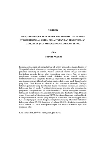Kemajuan teknologi telah mengubah banyak sektor, termasuk pertanian. Internet of Things (IoT) adalah salah satu perkembangan terbaru yang memungkinkan alat-alat pertanian terhubung ke internet. Potensi komersial stroberi sebagai komoditas hortikultura menarik karena nilai ekonominya yang tinggi. Saat ini proses penyiraman tanaman stroberi masih dilakukan secara manual, sehingga membutuhkan waktu yang lama dan tenaga kerja manusia. Hal ini membuat proses penyiraman menjadi tidak efektif untuk menjaga kelengasan tanah dalam kondisi yang ideal. Oleh karena itu dibutuhkan alat penyiraman otomatis. Terdapat beberapa parameter yang diperhatikan dalam penyiraman otomatis, di antaranya kelengasan dan pH tanah. Penelitian ini merancang prototipe alat pemantau dan pengontrol kelengasan serta pH tanah berbasis IoT, dengan menggunakan sensor kelengasan dan pH tanah sebagai parameter utama serta dua buah pompa. Data dari sensor diproses oleh Mikrokontroler ESP32 dan ditampilkan pada platform Blynk. Kelengasan tanaman stroberi yang diinginkan diatas 80% dan rentang pH antara 6,5-7. Saat pengujian sensor, didapatkan tingkat akurasi yang dihasilkan oleh sensor kelengasan sebesar 85,99% dan sensor pH sebesar 99,82 %. Selain itu, terdapat jeda waktu sebesar 1.12 detik pada aplikasi Blynk saat melakukan kendali nyala atau mati pada relay. Kata Kunci : IoT, Stroberi, Kelengasan, pH, Blynk Technological advancements have transformed many sectors, including agriculture. The Internet of Things (IoT) is one of the latest developments that allows agricultural tools to connect to the internet. The commercial potential of strawberries as a horticultural commodity is attractive due to its high economic value. Currently, the process of watering strawberry plants is still done manually, so it takes a long time and human labor. This makes the watering process ineffective to maintain soil moisture in ideal conditions. Therefore an automatic watering tool is needed. There are several parameters that are considered in automatic watering, including soil hardness and pH. This study designed a prototype of IoT-based soil moisture and pH monitoring and control, using soil moisture and pH sensors as the main parameters and two pumps. Data from the sensor is processed by the ESP32 Microcontroller and displayed on the Blynk platform. The desired hardness of strawberry plants is above 80% and the pH range is between 6.5-7. When testing the sensor, the accuracy level produced by the exhaust sensor was 85.99% and the pH sensor was 99.82%. In addition, there is a time lag of 1.12 seconds on the Blynk application when controlling the on/off on the relay. Keywords : IoT, Strawberry, Soil Moisture, pH, Blynk