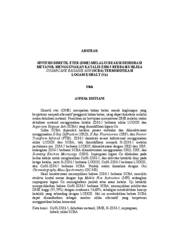 ANNISA, DISTIANI (2025) SINTESIS DIMETIL ETER (DME) MELALUI REAKSI DEHIDRASI METANOL MENGGUNAKAN KATALIS ZSM-5 BERBASIS SILIKA SUGARCANE BAGASSE ASH (SCBA) TERMODIFIKASI LOGAM KOBALT (Co). MATEMATIKA DAN ILMU PENGETAHUAN ALAM, UNIVERSITAS LAMPUNG.