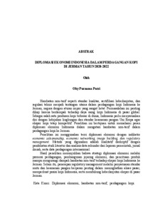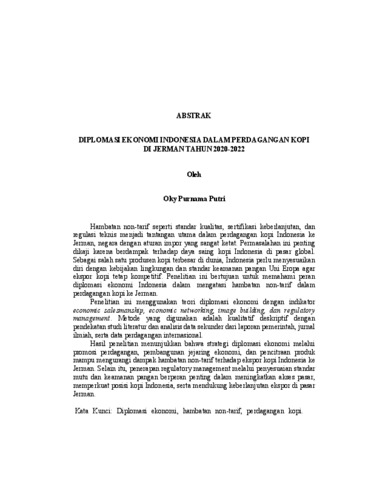 Hambatan non-tarif seperti standar kualitas, sertifikasi keberlanjutan, dan regulasi teknis menjadi tantangan utama dalam perdagangan kopi Indonesia ke Jerman, negara dengan aturan impor yang sangat ketat. Permasalahan ini penting dikaji karena berdampak terhadap daya saing kopi Indonesia di pasar global. Sebagai salah satu produsen kopi terbesar di dunia, Indonesia perlu menyesuaikan diri dengan kebijakan lingkungan dan standar keamanan pangan Uni Eropa agar ekspor kopi tetap kompetitif. Penelitian ini bertujuan untuk memahami peran diplomasi ekonomi Indonesia dalam mengatasi hambatan non-tarif dalam perdagangan kopi ke Jerman. Penelitian ini menggunakan teori diplomasi ekonomi dengan indikator economic salesmanship, economic networking, image building, dan regulatory management. Metode yang digunakan adalah kualitatif deskriptif dengan pendekatan studi literatur dan analisis data sekunder dari laporan pemerintah, jurnal ilmiah, serta data perdagangan internasional. Hasil penelitian menunjukkan bahwa strategi diplomasi ekonomi melalui promosi perdagangan, pembangunan jejaring ekonomi, dan pencitraan produk mampu mengurangi dampak hambatan non-tarif terhadap ekspor kopi Indonesia ke Jerman. Selain itu, penerapan regulatory management melalui penyesuaian standar mutu dan keamanan pangan berperan penting dalam meningkatkan akses pasar, memperkuat posisi kopi Indonesia, serta mendukung keberlanjutan ekspor di pasar Jerman. Kata Kunci: Diplomasi ekonomi, hambatan non-tarif, perdagangan kopi. Non-tariff barriers such as quality standards, sustainability certification, and technical regulations are major challenges in Indonesian coffee trade with Germany, a country with very strict import regulations. This issue is important to examine because it impacts the competitiveness of Indonesian coffee in the global market. As one of the world's largest coffee producers, Indonesia needs to adapt to the European Union's environmental policies and food safety standards to maintain competitive coffee exports. This study aims to understand the role of Indonesian economic diplomacy in overcoming non-tariff barriers in coffee trade with Germany. This study uses economic diplomacy theory with indicators of economic salesmanship, economic networking, image building, and regulatory management. The method used is descriptive qualitative, using a literature study approach and secondary data analysis from government reports, scientific journals, and international trade data. The results show that economic diplomacy strategies through trade promotion, economic network building, and product branding can mitigate the impact of non-tariff barriers on Indonesian coffee exports to Germany. Furthermore, the implementation of regulatory management through adjustments to quality and food safety standards plays a crucial role in increasing market access, strengthening the position of Indonesian coffee, and supporting the sustainability of exports in the German market. Keywords : Economic diplomacy, non-tariff barriers, coffee trade.