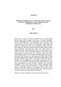 Koridor Jalan. Ki Hajar. Dewantara merupakan kawasan dengan tingkat aktivitas tinggi, karena lokasinya yang berada di kawasan. pendidikan. Koridor ini menghadapi sejumlah permasalahan pada kondisi fisik koridor Jalan Ki Hajar Dewantara yang berdampak pada kenyamanan dan keselamatan pejalan kaki seperti tidak tersedianya fasilitas pendukung pejalan kaki, inkonsistensi lebar jalan dan penempatan utilitas kawasan di jalur pejalan kaki. Kemudian tingginya aktivitas di koridor memicu perilaku yang mengganggu kenyamanan dan fungsi ruang publik antara lain; pedagang kaki lima yang menempatkan tenda, kursi, dan gerobak di atas trotoar, serta adanya reklame dan parkir kendaraan pembeli yang semakin mempersempit ruang bagi pejalan kaki. Penelitian ini bertujuan untuk mengidentifikasi kondisi fisik, memahami gambaran perilaku dan aktivitas yang terjadi di dalamnya, serta merancang ulang koridor Jalan Ki Hajar Dewantara dengan pendekatan perilaku. Penelitian ini menggunakan metode deskriptif kualitatif dengan teknik walk-through analysis dan behaviour mapping untuk mengidentifikasi serta menganalisis permasalahan fisik dan non-fisik di kawasan tersebut. Pendekatan perilaku dilengkapi dengan narasi trilogi kepemimpinan Ki Hajar Dewantara digunakan untuk membantu merumuskan solusi yang relevan dengan kawasan pendidikan. Hasil penelitian menunjukkan adanya ketidaksesuaian terhadap standar fasilitas kawasan, seperti jalur pedestrian, tata bangunan, dan tata kelola ruang. Berdasarkan temuan ini, disusun redesain koridor Jalan Ki Hajar Dewantara sebagai pendukung kawasan pendidikan di Kota Metro. Kata Kunci: koridor; pendidikan; perancangan; perilaku; Kota The Ki Hajar Dewantara Street corridor is a high-activity area due to its location within an educational district. This corridor faces several issues related to its physical condition, which impact pedestrian comfort and safety. These issues include the lack of pedestrian-supporting facilities, inconsistency in road width, and the placement of public utilities on pedestrian pathways. Additionally, the high level of activity in the corridor has led to behaviors that disrupt the comfort and function of public spaces, such as street vendors setting up tents, chairs, and carts on sidewalks, as well as the presence of billboards and customer parking that further restrict pedestrian space. This study aims to identify the physical conditions of the corridor, understand the behavioral patterns and activities within it, and propose a redesign of the Ki Hajar Dewantara Street corridor using a behavioral approach. The research employs a qualitative descriptive method, utilizing walkthrough analysis. and behavior mapping techniques to identify and analyze both physical and non-physical issues in the area. The behavioral approach is complemented by the narrative of Ki Hajar Dewantara's leadership trilogy to formulate solutions that align with the educational context of the area. The findings indicate discrepancies with standard urban facilities, such as pedestrian pathways, building arrangements, and spatial management. Based on these findings, a redesign of the Ki Hajar Dewantara Street corridor has been proposed to support the educational area in Metro City. Keywords: corridor; education; behaviour; design; Metro City