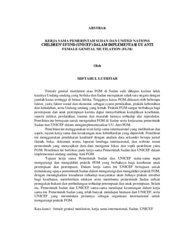 Miftahul , Luthfiah (2025) KERJA SAMA PEMERINTAH SUDAN DAN UNITED NATIONS CHILDREN’S FUND (UNICEF) DALAM IMPLEMENTASI UU ANTI FEMALE GENITAL MUTILATION (FGM). FAKULTAS ILMU SOSIAL DAN ILMU POLITIK, UNIVERSITAS LAMPUNG.