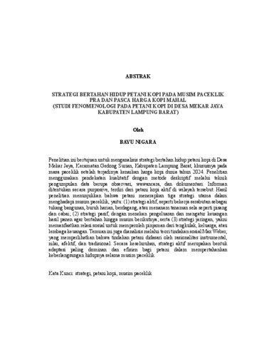BAYU , NIGARA (2025) STRATEGI BERTAHAN HIDUP PETANI KOPI PADA MUSIM PACEKLIK PRA DAN PASCA HARGA KOPI MAHAL (STUDI FENOMENOLOGI PADA PETANI KOPI DI DESA MEKAR JAYA KABUPATEN LAMPUNG BARAT). FAKULTAS ILMU SOSIAL DAN ILMU POLITIK, UNIVERSITAS LAMPUNG.