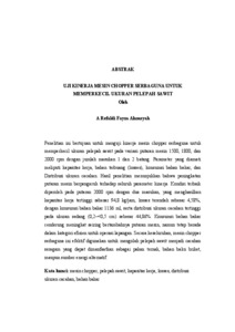 Penelitian ini bertujuan untuk menguji kinerja mesin chopper serbaguna untuk memperkecil ukuran pelepah sawit pada variasi putaran mesin 1500, 1800, dan 2000 rpm dengan jumlah masukan 1 dan 2 batang. Parameter yang diamati meliputi kapasitas kerja, bahan terbuang (losses), konsumsi bahan bakar, dan Distribusi ukuran cacahan. Hasil penelitian menunjukkan bahwa peningkatan putaran mesin berpengaruh terhadap seluruh parameter kinerja. Kondisi terbaik diperoleh pada putaran 2000 rpm dengan dua masukan, yang menghasilkan kapasitas kerja tertinggi sebesar 94,8 kg/jam, losses terendah sebesar 4,58%, dengan konsumsi bahan bakar 1136 ml, serta distribusi ukuran cacahan tertinggi pada ukuran sedang (0,2–<0,5 cm) sebesar 44,86%. Konsumsi bahan bakar cenderung meningkat seiring bertambahnya putaran mesin, namun tetap berada dalam kategori efisien untuk operasi lapangan. Secara keseluruhan, mesin chopper serbaguna ini efektif digunakan untuk mengolah pelepah sawit menjadi cacahan seragam yang dapat dimanfaatkan sebagai pakan ternak, bahan baku briket, maupun sumber energi alternatif. Kata kunci: mesin chopper, pelepah sawit, kapasitas kerja, losses, distribusi ukuran cacahan, bahan bakar