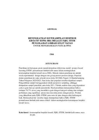 SITI, NURANI (2025) MENINGKATKAN KETERAMPILAN BERPIKIR KREATIF SISWA SMA MELALUI PjBL-STEM PENGOLAHAN LIMBAH KULIT NANAS UNTUK MENGHASILKAN NATA de PINA. FAKULTAS KEGURUAN DAN ILMU PENDIDIKAN, Universitas Lampung.