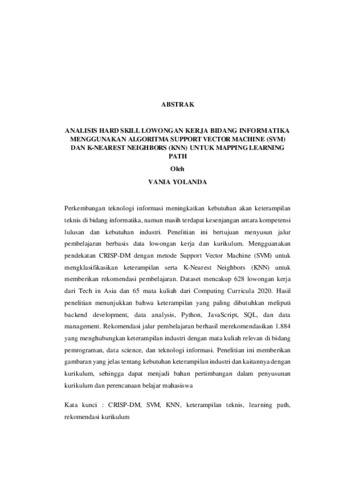 VANIA, YOLANDA (2025) ANALISIS HARD SKILL LOWONGAN KERJA BIDANG INFORMATIKA MENGGUNAKAN ALGORITMA SUPPORT VECTOR MACHINE (SVM) DAN K-NEAREST NEIGHBORS (KNN) UNTUK MAPPING LEARNING PATH. FAKULTAS TEKNIK, UNIVERSITAS LAMPUNG.