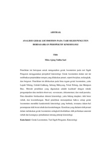 Penelitian ini bertujuan untuk menganalisis gerak locomotion pada tari Sigeh Penguten menggunakan perspektif kinesiologi. Gerak locomotion dalam tari ini melibatkan perpindahan tempat yang dilakukan penari, seperti berjalan, melangkah, dan bergeser. Penelitian ini difokuskan pada lima ragam gerak locomotion, yaitu Lapah Tebeng, Gubuh Gakhang, Sabung Melayang, Tolak Tebeng, dan Mempam Bias. Metode penelitian yang digunakan adalah kualitatif dengan teknik pengumpulan data melalui observasi, wawancara, dokumentasi, dan studi pustaka. Data dianalisis berdasarkan elemen kinesiologi, yaitu bidang imajiner, titik berat tubuh, dan keseimbangan. Hasil penelitian menunjukkan bahwa setiap gerak locomotion memiliki karakteristik kinesiologi yang berbeda, terutama dalam hal penempatan titik berat tubuh dan keseimbangan. Kesulitan yang dialami oleh penari dalam melakukan gerak locomotion seringkali disebabkan oleh perbedaan anatomi tubuh dan kurangnya pemahaman tentang prinsip kinesiologi. Kata kunci: Gerak Locomotion, Tari Sigeh Penguten, Kinesiologi This study aims to analyze the locomotion movements in the Sigeh Penguten dance using a kinesiology perspective. Locomotion movements in this dance involve the dancers moving from one place to another, such as walking, stepping, and shifting. This research focuses on five types of locomotion movements: Lapah Tebeng, Gubuh Gakhang, Sabung Melayang, Tolak Tebeng, and Mempam Bias. The research method used is qualitative, with data collection techniques including observation, interviews, documentation, and literature review. The data were analyzed based on kinesiology elements, namely the imaginary plane, center of gravity, and balance. The results show that each locomotion movement has distinct kinesiological characteristics, particularly in terms of the placement of the center of gravity and balance. Difficulties experienced by dancers in performing locomotion movements are often caused by differences in body anatomy and a lack of understanding of kinesiology principles. Keywords: Locomotion Movements, Sigeh Penguten Dance, Kinesiology