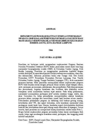 FAIZ GUSRA , ALQURBI (2025) IMPLEMENTASI PROGRAM BANTUAN STIMULAN PERUMAHAN SWADAYA (BSPS) DALAM PEMENUHAN RUMAH LAYAK HUNI BAGI MASYARAKAT BERPENGHASILAN RENDAH (MBR) DI KELURAHAN SUMBER AGUNG, KOTA BANDAR LAMPUNG. FAKULTAS ILMU SOSIAL DAN ILMU POLITIK, UNIVERSITAS LAMPUNG.
