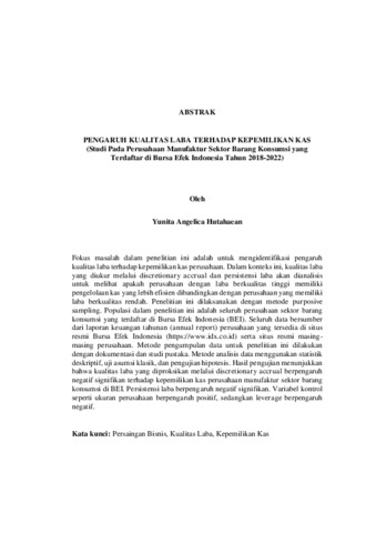 Yunita, Angelica Hutahaean (2025) PENGARUH KUALITAS LABA TERHADAP KEPEMILIKAN KAS (Studi Pada Perusahaan Manufaktur Sektor Barang Konsumsi yang Terdaftar di Bursa Efek Indonesia Tahun 2018-2022). FAKULTAS EKONOMI DAN BISNIS, UNIVERSITAS LAMPUNG.