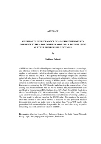 Meiliana Zalianti , - (2025) ASSESSING THE PERFORMANCE OF ADAPTIVE NEURO-FUZZY INFERENCE SYSTEM FOR COMPLEX NONLINEAR SYSTEMS USING MULTIPLE MEMBERSHIP FUNCTIONS. FAKULTAS MATEMATIKA DAN ILMU PENGETAHUAN ALAM, UNIVERSITAS LAMPUNG.