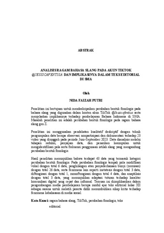 NIDA , FAIZAH PUTRI (2025) ANALISIS RAGAM BAHASA SLANG PADA AKUN TIKTOK @JESSICAFENTISA DAN IMPLIKASINYA DALAM TEKS EDITORIAL DI SMA. FAKULTAS KEGURUAN DAN ILMU PENDIDIKAN, UNIVERSITAS LAMPUNG.
