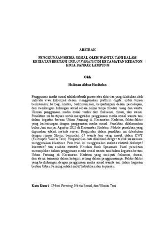 Penggunaan media sosial adalah sebuah proses atau aktivitas yang dilakukan oleh individu atau kelompok dalam menggunakan platform digital untuk tujuan berinteraksi, berbagi konten, berkomunikasi, berpartisipasi dalam percakapan, dan membangun hubungan sosial secara online tanpa dibatasi ruang dan waktu. Ukuran penggunaan media sosial terdiri dari frekuensi, durasi, dan atensi. Penelitian ini bertujuan untuk mengetahui penggunaan media sosial wanita tani dalam kegiatan bertani Urban Farming di Kecamatan Kedaton, faktor-faktor yang berhubungan dengan penggunaan media sosial. Penelitian dilaksanakan bulan Juni sampai Agustus 2025 di Kecamatan Kedaton. Metode penelitian yang digunakan adalah metode survei. Responden dalam penelitian ini ditentukan dengan rumus Slovin, berjumlah 67 wanita tani yang masuk dalam KWT (Kelompok Wanita Tani). Pengambilan data dilakukan dengan teknik wawancara menggunakan kuesioner. Penelitian ini menggunakan analisis statistik deskriptif kuantitatif dan analisis statistik Korelasi Rank Spearman. Hasil penelitian menunjukkan bahwa penggunaan media sosial wanita tani dalam kegiatan bertani Urban Farming di Kecamatan Kedaton yang meliputi frekuensi, durasi, dan atensi termasuk dalam kategori sedang dalam penggunaannya. Faktor-faktor yang berhubungan dengan penggunaan media sosial wanita tani dalam kegiatan bertani Urban Farming adalah motif kebutuhan dan kepuasan. Kata Kunci : Urban Farming, Media Sosial, dan Wanita Tani Social media use is a process or activity undertaken by individuals or groups using digital platforms to interact, share content, communicate, participate in conversations, and build social relationships online without being limited by time and space. Measures of social media use include frequency, duration, and attention. This study aims to determine the social media use of female farmers in urban farming activities in Kedaton District, and the factors associated with social media use. The study was conducted from June to August 2025 in Kedaton District. The research method used was a survey. Respondents in this study were determined using the Slovin formula and consisted of 67 female farmers who were members of the Women Farmers Group (KWT). Data collection was conducted using interviews and questionnaires. This study employed descriptive quantitative statistical analysis and Spearman Rank Correlation. The research results show that female farmers' social media use in urban farming activities in Kedaton District, including frequency, duration, and attention, falls into the moderate category. Factors associated with female farmers' social media use in urban farming activities are needs and satisfaction. Keywords : Urban Farming, Social Media, and Women Farmer