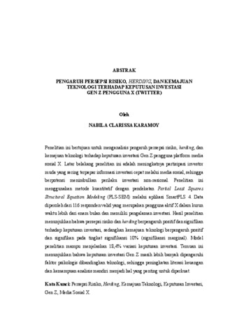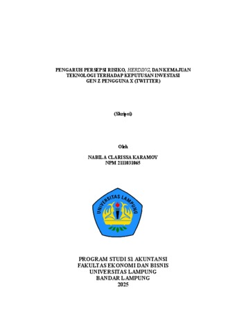 NABILA CLARISSA , KARAMOY (2025) PENGARUH PERSEPSI RISIKO, HERDING, DAN KEMAJUAN TEKNOLOGI TERHADAP KEPUTUSAN INVESTASI GEN Z PENGGUNA X (TWITTER). FAKULTAS EKONOMI DAN BISNIS, UNIVERSITAS LAMPUNG.
