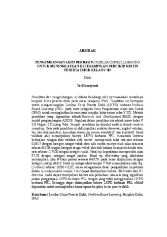 TRI , DAMAYANTI (2025) PENGEMBANGAN LKPD BERBASIS PROBLEM BASED LEARNING UNTUK MENINGKATKAN KETERAMPILAN BERPIKIR KRITIS PESERTA DIDIK KELAS V SD. Masters thesis, UNIVERSITAS LAMPUNG.