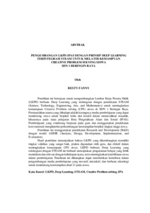 Penelitian ini bertujuan untuk mengembangkan Lembar Kerja Peserta Didik (LKPD) berbasis Deep Learning yang terintegrasi dengan pendekatan STEAM (Science, Technology, Engineering, Arts, and Mathematics) untuk meningkatkan kemampuan Creative Problem solving (CPS) siswa di SDN 1 Beringin Raya. Permasalahan utama yang dihadapi adalah kurangnya media pembelajaran yang dapat mendorong siswa untuk berpikir kritis dan kreatif dalam memecahkan masalah, khususnya pada mata pelajaran Ilmu Pengetahuan Alam dan Sosial (IPAS). Pembelajaran yang cenderung berpusat pada guru dan menggunakan pendekatan konvensional menghambat perkembangan keterampilan berpikir tingkat tinggi siswa. Penelitian ini menggunakan pendekatan Research and Development (R&D) dengan model ADDIE (Analysis, Design, Development, Implementation, and Evaluation). Hasil penelitian menunjukkan bahwa LKPD yang dikembangkan memiliki tingkat validitas yang sangat baik, praktis digunakan oleh guru, dan efektif dalam meningkatkan kemampuan CPS siswa. LKPD berbasis Deep Learning yang terintegrasi dengan STEAM ini berhasil menciptakan pengalaman belajar yang lebih mendalam dan relevan dengan kehidupan nyata, serta meningkatkan keterlibatan siswa dalam pembelajaran. Penelitian ini diharapkan dapat memberikan kontribusi dalam pengembangan media pembelajaran yang inovatif, interaktif, dan berbasis teknologi untuk mendukung keterampilan abad 21 pada siswa. Kata Kunci: LKPD, Deep Learning, STEAM, Creative Problem solving, IPA This study aims to develop a Student Worksheet (LKPD) based on the principles of Deep Learning integrated with the STEAM (Science, Technology, Engineering, Arts, Mathematics) approach to enhance elementary students’ Creative Problem Solving (CPS) skills. The research employed a research and development design using the ADDIE model, consisting of analysis, design, development, implementation, and evaluation stages. The participants were fourth-grade students at SDN 1 Beringin Raya, along with their IPAS subject teachers. Data were collected through expert validation, teacher and student response questionnaires, and CPS skill assessments. The findings indicate that the developed LKPD is valid, practical for classroom use, and effective in fostering students’ creative problem-solving abilities. The integration of Deep Learning and STEAM provides students with a deeper, contextual, and more meaningful learning experience relevant to real-life situations. Therefore, this product can serve as an innovative learning medium that supports the implementation of the Merdeka Curriculum and the development of 21st-century skills. Keywords: LKPD, Deep Learning, STEAM, Creative Problem Solving, IPAS.