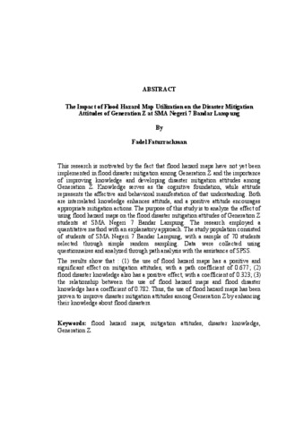Penelitian ini dilatarbelakangi oleh belum diterapkannya penggunaan peta rawan bencana banjir dalam mitigasi bencana banjir generasi Z serta pentingnya peningkatan pengetahuan dan pembentukan sikap mitigasi bencana pada generasi Z. Pengetahuan berperan sebagai dasar pemahaman kognitif, sedangkan sikap merupakan perwujudan afektif dan perilaku dari pemahaman tersebut. Keduanya saling berhubungan, pengetahuan meningkatkan sikap, dan sikap yang baik mendorong tindakan mitigasi yang tepat. Tujuan penelitian ini adalah menganalisis pengaruh penggunaan peta rawan bencana banjir terhadap sikap mitigasi bencana banjir generasi Z di SMA Negeri 7 Bandar Lampung. Penelitian menggunakan metode kuantitatif dengan pendekatan explanatory. Populasi penelitian adalah siswa SMA Negeri 7 Bandar Lampung, dengan sampel 70 siswa yang dipilih melalui simple random sampling. Data dikumpulkan melalui kuesioner dan dianalisis menggunakan analisis jalur (path analysis) dengan bantuan SPSS. Hasil penelitian menunjukkan bahwa: (1) penggunaan peta rawan bencana banjir berpengaruh positif dan signifikan terhadap sikap mitigasi dengan koefisien jalur 0,677; (2) pengetahuan bencana juga berpengaruh positif dengan koefisien 0,323; (3) hubungan antara penggunaan peta dan pengetahuan bencana memiliki koefisien 0,782. Dengan demikian, penggunaan peta rawan bencana terbukti meningkatkan sikap mitigasi bencana banjir pada generasi Z melalui peningkatan pengetahuan mereka tentang bencana banjir. Kata Kunci: peta rawan bencana banjir, sikap mitigasi, pengetahuan bencana, generasi z
