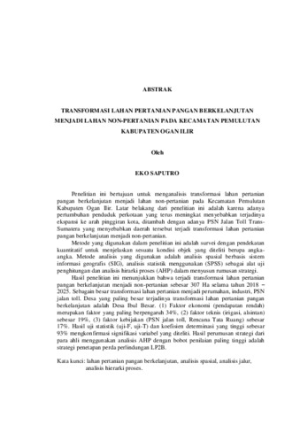 Penelitian ini bertujuan untuk menganalisis transformasi lahan pertanian pangan berkelanjutan menjadi lahan non-pertanian pada Kecamatan Pemulutan Kabupaten Ogan Ilir. Latar belakang dari penelitian ini adalah karena adanya pertumbuhan penduduk perkotaan yang terus meningkat menyebabkan terjadinya ekspansi ke arah pinggiran kota, ditambah dengan adanya PSN Jalan Toll TransSumatera yang menyebabkan daerah tersebut terjadi transformasi lahan pertanian pangan berkelanjutan menjadi non-pertanian. Metode yang digunakan dalam penelitian ini adalah survei dengan pendekatan kuantitatif untuk menjelaskan sesuatu kondisi objek yang diteliti berupa angkaangka. Metode analisis yang digunakan adalah analisis spasial berbasis sistem informasi geografis (SIG), analisis statistik menggunakan (SPSS) sebagai alat uji penghitungan dan analisis hirarki proses (AHP) dalam menyusun rumusan strategi. Hasil penelitian ini menunjukkan bahwa terjadi transformasi lahan pertanian pangan berkelanjutan menjadi non-pertanian sebesar 307 Ha selama tahun 2018 – 2025. Sebagain besar transformasi lahan pertanian menjadi perumahan, industri, PSN jalan toll. Desa yang paling besar terjadinya transformasi lahan pertanian pangan berkelanjutan adalah Desa Ibul Besar. (1) Faktor ekonomi (pendapatan rendah) merupakan faktor yang paling berpengaruh 34%, (2) faktor teknis (irigasi, alsintan) sebesar 19%, (3) faktor kebijakan (PSN jalan toll, Rencana Tata Ruang) sebesar 17%. Hasil uji statistik (uji-F, uji-T) dan koefisien determinasi yang tinggi sebesar 93% mengkonfirmasi signifikasi variabel yang diteliti. Hasil perumusan strategi dari para ahli menggunakan analisis AHP dengan bobot penilaian paling tinggi adalah strategi penetapan perda perlindungan LP2B. Kata kunci: lahan pertanian pangan berkelanjutan, analisis spasial, analisis jalur,analisis hierarki proses. This study aims to analyze the transformation of sustainable food agricultural land into non-agricultural land in Pemulutan District, Ogan Ilir Regency. The background of this research is the continuous growth of the urban population, which has led to expansion towards the outskirts of the city. This expansion is further accelerated by the development of the National Strategic Project (NSP), specifically the Trans-Sumatra toll road, turning the area into a rapidly growing zone and resulting in the conversion of sustainable agricultural land into nonagricultural uses. The method used in this study is a survey with a quantitative approach to explain the condition of the research object in the form of numerical data. The data analysis methods employed include spatial analysis based on Geographic Information Systems (GIS) using overlay techniques, statistical analysis using SPSS as a calculation tool, and the Analytic Hierarchy Process (AHP) for formulating strategy recommendations. The results of the study indicate that there has been a transformation of 307 hectares of sustainable food agricultural land into non-agricultural uses between 2018 and 2025. Most of this land conversion is to housing, industry, the toll road NSP, and plantations. The village with the largest transformation is Ibul Besar. The most influential factor is economic (low income) at 34%, followed by technical factors (such as irrigation and agricultural machinery) at 19%, and policy factors (such as the toll road and spatial planning) at 17%. The statistical tests (F-test and T-test) and a high coefficient of determination (R² = 93%) confirm the significance of the variables studied. The strategy formulation results from experts using the AHP analysis show that the highest priority strategy is the enactment of a regional regulation (perda) for the protection of sustainable food agricultural land. Key words: sustainable food agricultural land, spatial analysis, path analysis, analytical hierarchy process.