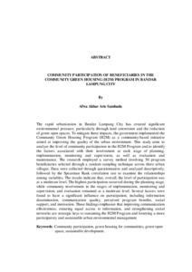 The rapid urbanization in Bandar Lampung City has created significant environmental pressure, particularly through land conversion and the reduction of green open spaces. To mitigate these impacts, the government implemented the Community Green Housing Program (H2M) as a community-based initiative aimed at improving the quality of the urban environment. This study aims to analyze the level of community participation in the H2M Program and to identify the factors associated with their involvement at each stage of planning, implementation, monitoring and supervision, as well as evaluation and maintenance. The research employed a survey method involving 50 program beneficiaries selected through a random sampling technique across three urban villages. Data were collected through questionnaires and analyzed descriptively, followed by the Spearman Rank correlation test to examine the relationships among variables. The results indicate that, overall, the level of participation was at a moderate level. The highest participation occurred during the planning stage, while community involvement in the stages of implementation, monitoring and supervision, and evaluation remained at a moderate level. Several factors were found to have a significant influence on participation, including information dissemination, communication quality, perceived program benefits, social support, and motivation. These findings emphasize that improving communication effectiveness, ensuring equal access to information, and strengthening social networks are strategic keys to sustaining the H2M Program and fostering a more participatory and sustainable urban environmental management Keywords: Community participation, green housing for communities, green open space, sustainable development. Urbanisasi yang pesat di Kota Bandar Lampung telah menimbulkan tekanan terhadap lingkungan, terutama melalui alih fungsi lahan dan berkurangnya ruang terbuka hijau. Untuk menanggulangi dampak tersebut, pemerintah melaksanakan Program Hunian Hijau Masyarakat (H2M) sebagai inisiatif berbasis komunitas guna meningkatkan kualitas lingkungan perkotaan. Penelitian ini bertujuan untuk menganalisis tingkat partisipasi masyarakat dalam Program H2M serta mengidentifikasi faktor-faktor yang berkaitan dengan keterlibatan mereka pada setiap tahap perencanaan, pelaksanaan, pemantauan dan pengawasan serta evaluasi dan pemeliharaan pada program H2M. Pendekatan penelitian menggunakan metode survei terhadap 50 penerima program menggunakan teknik random sampling yang tersebar di tiga kelurahan. Data dikumpulkan melalui kuesioner dan dianalisis secara deskriptif serta dengan uji korelasi Rank Spearman untuk menguji hubungan antar variabel. Hasil penelitian menunjukkan bahwa secara keseluruhan tingkat partisipasi berada pada tingkat sedang. Tingkat partisipasi tertinggi terjadi pada tahap perencanaan, sedangkan keterlibatan masyarakat dalam tahap pelaksanaan pemantauan dan pengawasan dan evaluasi masih berada pada kategori sedang. Terdapat faktor faktor yang memiliki pengaruh secara nyata, yaitu sebaran informasi, tingkat komunikasi, manfaat program, tingkat dukungan lingkungan sosial dan motivasi, terbukti berpengaruh signifikan terhadap tingkat partisipasi. Temuan ini menegaskan bahwa peningkatan efektivitas komunikasi, pemerataan informasi, dan penguatan jejaring sosial menjadi kunci strategis dalam menjaga keberlanjutan Program H2M sekaligus mendorong pengelolaan lingkungan perkotaan yang lebih partisipatif dan berkelanjutan. Kata kunci: Partisipasi masyarakat, H2M, ruang terbuka hijau, pembangunan berkelanjutan