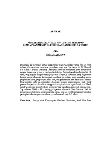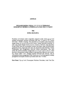 Penelitian ini bertujuan untuk mengetahui pengaruh media visual pop-up book terhadap kemampuan membaca permulaan anak usia 5–6 tahun di TK Ummul Mu’miniin 1 Bandar Lampung. Jenis penelitian ini merupakan quasi-eksperimen dengan desain one group pretest-posttest design. Sampel penelitian berjumlah 16 anak, yang dipilih dengan teknik purposive sampling. Instrumen yang digunakan berupa lembar observasi kemampuan membaca permulaan yang mencakup aspek pengenalan huruf, pengucapan suku kata, dan penyusunan kata sederhana. Teknik Pengumpulan data menggunakan observasi selama pembelajaran. Data hasil pretest dan posttest dianalisis menggunakan uji wilcoxon signed rank test. Hasil penelitian menunjukkan terdapat pengaruh yang signifikan diperoleh nilai Asymp. Sig. sebesar 0,000 < 0,05, sehingga hipotesis alternatif (Ha) diterima. Hal ini menunjukkan bahwa penggunaan media visual pop-up book berpengaruh terhadap peningkatan kemampuan membaca permulaan anak usia 5–6 tahun. Kata Kunci: Pop-up book, Kemampuan Membaca Permulaan, Anak Usia Dini