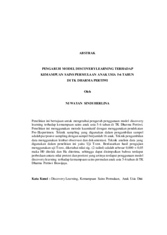 NI WAYAN, SINDI HERLINA (2025) PENGARUH MODEL DISCOVERY LEARNING TERHADAP KEMAMPUAN SAINS PERMULAAN ANAK USIA 5-6 TAHUN DI TK DHARMA PERTIWI. FAKULTAS KEGURUAN DAN ILMU PENDIDIKAN, UNIVERSITAS LAMPUNG.