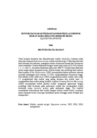 Telah berhasil disintesis dan dikarakterisasi mullite (Al6Si2O13) berbasis silika alami dari tanaman Equisetum arvense melalui metode sol-gel. Silika diperoleh dari hasil kalsinasi abu tanaman, sedangkan sumber aluminium berasal dari aluminium nitrat nonahidrat. Sintesis dilakukan dengan variasi rasio molar Al₂O₃:SiO₂ sebesar 1:1, 2:1, dan 3:1, kemudian dikalsinasi pada suhu 1000 °C. Karakterisasi dilakukan untuk mengevaluasi komposisi kimia, struktur kristal, dan morfologi hasil sintesis. Hasil analisis X-Ray Fluorescence (XRF) menunjukkan bahwa prekursor alumina memiliki kandungan Al₂O₃ sebesar 77,233%, mengindikasikan kemurnian tinggi. Pola difraksi X-Ray Diffraction (XRD) mengonfirmasi bahwa mullite rasio molar 3:1 menghasilkan fasa mullite yang paling dominan dan mullite rasio 2:1 menghasilkan fasa mullite paling kristalin. Analisis Scanning Electron Microscopy (SEM) menunjukkan bahwa partikel mullite mengalami aglomerasi dengan morfologi tidak beraturan pada perbesaran rendah dan menampilkan kristal berbentuk jarum (acicular grains) pada perbesaran tinggi. Ciri tersebut menandakan terbentuknya fase mullite dengan struktur kristal teratur, meskipun proses kalsinasi belum mencapai densifikasi penuh sehingga masih terdapat pori antarpartikel. Kata kunci: Mullite, metode sol-gel, Equisetum arvense, XRF, XRD, SEM, nanopartikel.