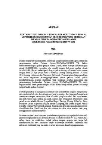 Dewansyah , Dwi Putra (2025) PERTANGGUNGJAWABAN PIDANA PELAKU TINDAK PIDANA MENDISTRIBUSIKAN MUATAN ELEKTRONIK YANG BERISIKAN MUATAN PEMERASAN DAN PENGANCAMAN (Studi Putusan Nomor.781/Pid.Sus/2023/PN Tjk). FAKULTAS HUKUM , UNIVERSITAS LAMPUNG.