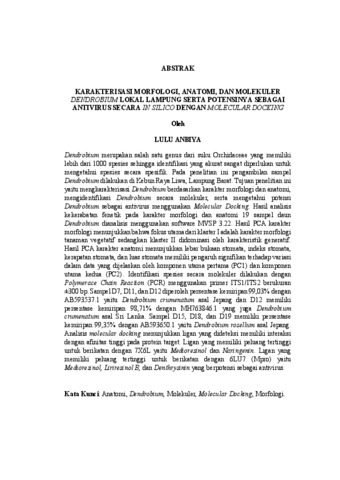 Dendrobium merupakan salah satu genus dari suku Orchidaceae yang memiliki lebih dari 1000 spesies sehingga identifikasi yang akurat sangat diperlukan untuk mengetahui spesies secara spesifik. Pada penelitian ini pengambilan sampel Dendrobium dilakukan di Kebun Raya Liwa, Lampung Barat. Tujuan penelitian ini yaitu mengkarakterisasi Dendrobium berdasarkan karakter morfologi dan anatomi, mengidentifikasi Dendrobium secara molekuler, serta mengetahui potensi Dendrobium sebagai antivirus menggunakan Molecular Docking. Hasil analisis kekerabatan fenetik pada karakter morfologi dan anatomi 19 sampel daun Dendrobium dianalisis menggunakan software MVSP 3.22. Hasil PCA karakter morfologi menunjukkan bahwa fokus utama dari klaster I adalah karakter morfologi tanaman vegetatif sedangkan klaster II didominasi oleh karakteristik generatif. Hasil PCA karakter anatomi menunjukkan lebar bukaan stomata, indeks stomata, kerapatan stomata, dan luas stomata memiliki pengaruh signifikan terhadap variasi dalam data yang dijelaskan oleh komponen utama pertama (PC1) dan komponen utama kedua (PC2). Identifikasi spesies secara molekuler dilakukan dengan Polymerace Chain Reaction (PCR) menggunakan primer ITS1/ITS2 berukuran ±300 bp. Sampel D7, D11, dan D12 diperoleh persentase kemiripan 99,03% dengan AB593537.1 yaitu Dendrobium crumenatum asal Jepang dan D12 memiliki persentase kemiripan 98,71% dengan MH763846.1 yang juga Dendrobium crumenatum asal Sri Lanka. Sampel D15, D18, dan D19 memiliki persentase kemiripan 99,35% dengan AB593650.1 yaitu Dendrobium rosellum asal Jepang. Analisis molecular docking menunjukkan ligan yang dideteksi memiliki interaksi dengan afinitas tinggi pada protein target. Ligan yang memiliki peluang tertinggi untuk berikatan dengan 7X6L yaitu Medioresinol dan Naringenin. Ligan yang memiliki peluang tertinggi untuk berikatan dengan 6LU7 (Mpro) yaitu Medioresinol, Liriresinol B, dan Denthrysinin yang berpotensi sebagai antivirus. Kata Kunci: Anatomi, Dendrobium, Molekuler, Molecular Docking, Morfologi. ABSTRACT Dendrobium is one of the genera in the Orchidaceae family, comprising more than 1,000 species, making accurate identification essential to determine specific species. In this study, Dendrobium samples were collected from Liwa Botanical Garden, West Lampung. The aim of this research was to characterize Dendrobium based on morphological and anatomical traits, identify the species molecularly, and assess its potential as an antiviral agent using molecular docking. Phylogenetic relationship analysis based on morphological and anatomical characters of 19 Dendrobium leaf samples was performed using MVSP 3.22 software. The PCA results of morphological characters showed that Cluster I was mainly focused on vegetative morphological traits, while Cluster II was dominated by generative characteristics. The PCA of anatomical characters indicated that stomatal aperture width, stomatal index, stomatal density, and stomatal area had a significant influence on variation, as explained by the first (PC1) and second (PC2) principal components. Molecular species identification was carried out using Polymerase Chain Reaction (PCR) with ITS1/ITS2 primers, producing fragments of approximately 300 bp. Samples D7, D11, and D12 showed 99.03% similarity with AB593537.1, identified as Dendrobium crumenatum from Japan, while D12 also showed 98.71% similarity with MH763846.1, Dendrobium crumenatum from Sri Lanka. Samples D15, D18, and D19 showed 99.35% similarity with AB593650.1, identified as Dendrobium rosellum from Japan. Molecular docking analysis showed that the detected ligands had high affinity interactions with target proteins. The ligands with the highest binding potential to 7X6L were Medioresinol and Naringenin. Meanwhile, the ligands with the highest binding potential to 6LU7 (Mpro) were Medioresinol, Liriresinol B, and Denthrysinin, which demonstrate potential as antiviral agents. Keywords: Anatomy, Dendrobium, Molecular, Molecular Docking, Morphology.