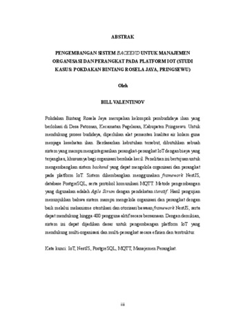 Pokdakan Bintang Rosela Jaya merupakan kelompok pembudidaya ikan yang berlokasi di Desa Patoman, Kecamatan Pagelaran, Kabupaten Pringsewu. Untuk mendukung proses budidaya, diperlukan alat pemantau kualitas air kolam guna menjaga kesehatan ikan. Berdasarkan kebutuhan tersebut, dibutuhkan sebuah sistem yang mampu mengintegrasikan perangkat-perangkat IoT dengan biaya yang terjangkau, khususnya bagi organisasi berskala kecil. Penelitian ini bertujuan untuk mengembangkan sistem backend yang dapat mengelola organisasi dan perangkat pada platform IoT. Sistem dikembangkan menggunakan framework NestJS, database PostgreSQL, serta protokol komunikasi MQTT. Metode pengembangan yang digunakan adalah Agile Scrum dengan pendekatan iteratif. Hasil pengujian menunjukkan bahwa sistem mampu mengelola organisasi dan perangkat dengan baik melalui mekanisme otentikasi dan otorisasi bawaan framework NestJS, serta dapat mendukung hingga 400 pengguna aktif secara bersamaan. Dengan demikian, sistem ini dapat dijadikan dasar untuk pengembangan platform IoT yang mendukung multi-organisasi dan multi-perangkat secara efisien dan terstruktur.