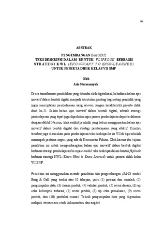 ARIS , NURMANSYAH (2025) PENGEMBANGAN E-MODUL TEKS DESKRIPSI DALAM BENTUK FLIPBOOK BERBASIS STRATEGI KWL (KNOW-WANT TO KNOW-LEARNED) UNTUK PESERTA DIDIK KELAS VII SMP. Masters thesis, UNIVERSITAS LAMPUNG.