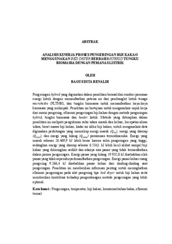 BAGUS DITA, RENALDI (2025) ANALISIS KINERJA PROSES PENGERINGAN BIJI KAKAO MENGGUNAKAN BED DRYER BERBASIS HYBRID TUNGKU BIOMASSA DENGAN PEMANAS LISTRIK. FAKULTAS TEKNIK (FT), Universitas Lampung.