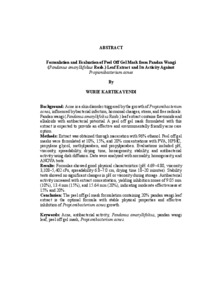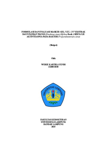 WURIE KARTIKA , YENDI (2025) FORMULASI DAN EVALUASI MASKER GEL PEEL OFF EKSTRAK DAUN PANDAN WANGI (Pandanus amaryllifolius Roxb.) SERTA UJI AKTIVITASNYA PADA BAKTERI Propionibacterium acnes. FAKULTAS KEDOKTERAN, UNIVERSITAS LAMPUNG.