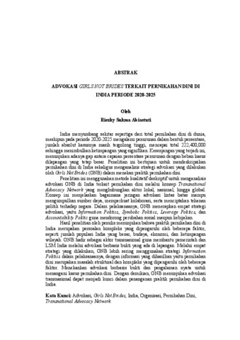 India menyumbang sekitar sepertiga dari total pernikahan dini di dunia, meskipun pada periode 2020-2025 mengalami penurunan dalam bentuk persentase, jumlah absolut kasusnya masih tergolong tinggi, mencapai total 222,400,000 sehingga menimbulkan ketimpangan yang signifikan. Kesenjangan yang terjadi ini, menunjukan adanya gap antara capaian persentase penurunan dengan beban kasus dilapangan yang tetap besar. Penelitian ini bertujuan untuk mendeskripsikan pernikahan dini di India sekaligus menganalisis strategi advokasi yang dilakukan oleh Girls Not Brides (GNB) dalam menekan praktik pernikahan dini. Penelitian ini menggunakan metode kualitatif deskriptif untuk menganalisis advokasi GNB di India terkait pernikahan dini melalui konsep Transnational Advocacy Network yang menghubungkan aktor lokal, nasional, hingga global. Konsep ini menjelaskan bagaimana jaringan advokasi lintas batas mampu mengumpulkan sumber daya, memperkuat kolaborasi, serta menciptakan tekanan politik terhadap negara. Dalam pelaksanaanya, GNB menerapkan empat strategi advokasi, yaitu Information Politics, Symbolic Politics, Leverage Politics, dan Accountability Politic guna mendorong perubahan sosial maupun kebijakan. Hasil penelitian oleh penulis menunjukan bahwa praktik pernikahan dini di India merupakan persoalan kompleks yang dipengaruhi oleh beberapa faktor, seperti jumlah populasi India yang besar, budaya, ekonomi, dan ketimpangan wilayah. GNB hadir sebagai aktor transnasional guna membantu pemerintah dan LSM India melalui advokasi berbasis bukti yang ada di lapangan. Melalui empat strategi yang dilakukan, GNB lebih sering menggunakan strategi Information Politics dalam pelaksanaanya, dengan informasi yang dihasilkan yaitu pernikahan dini merupakan masalah struktural dan kompleks yang dipengaruhi oleh beberapa faktor. Menekankan advokasi berbasis bukti dan pengalaman nyata untuk menangani kasus pernikahan dini. Dengan demikian, GNB menunjukan advokasi transnasional dapat menjadi kunci dalam penanganan praktik pernikahan dini di India. Kata Kunci: Advokasi, Girls Not Brides, India, Organisasi, Pernikahan Dini, Transnational Advocacy Network. India accounts for approximately one-third of all child marriages worldwide. Although the period 2020–2025 has shown a decline in percentage terms, the absolute number of cases remains high, reaching 222,400,000 thereby creating significant disparities. This gap highlights a discrepancy between the percentage-based reduction and the persistently large burden of cases on the ground. This study aims to describe the phenomenon of child marriage in India while analyzing the advocacy strategies undertaken by Girls Not Brides (GNB) to address the issue. This research employs a descriptive qualitative method to analyze GNB’s advocacy efforts in reducing child marriage in India through the concept of the Transnational Advocacy Network, which connects local, national, and global actors. The concept illustrates how cross-border advocacy networks are able to mobilize resources, strengthen collaboration, and exert political pressure on states. In practice, GNB applies four key advocacy strategies—Information Politics, Symbolic Politics, Leverage Politics, and Accountability Politics—to promote both social and policy change. The findings indicate that child marriage in India is a complex issue influenced by multiple factors, including the country’s large population, cultural norms, economic conditions, and regional disparities. GNB, as a transnational actor, supports the Indian government and local NGOs through evidence-based advocacy informed by field realities. Among the four strategies, Information Politics is most frequently employed, emphasizing evidence-based advocacy and real-life experiences to frame child marriage as a structural and multifaceted problem. This study demonstrates that transnational advocacy can play a crucial role in addressing child marriage in India. Keywords: Advocacy, Child Marriage, Girls Not Brides, India, Organization, Transnational Advocacy Network.