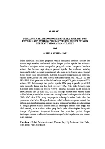 Telah dilakukan penelitian pengaruh variasi komposisi batubara antrasit dan kotoran sapi terhadap karakteristik briket dengan perekat tapioka dan molasses. Penelitian bertujuan untuk mengetahui pengaruh variasi komposisi batubara antrasit dan kotoran sapi dengan perekat tapioka dan molasses terhadap karakteristik briket, meliputi uji proksimat, nilai kalor, serta struktur mikro. Sampel dibuat dalam enam komposisi (K1-K6) dan dianalisis menggunakan uji kadar air, volatile matter, kadar abu, fixed carbon, serta karakterisasi XRF, XRD, FTIR, dan SEM-EDS. Hasil penelitian terlihat bahwa hanya sampel K1, yaitu komposisi 70% antrasit, 20% kotoran sapi, dan perekat tapioka 10%, yang terpenuhi syarat SNI pada parameter kadar abu dan fixed carbon (77,7%). Nilai kalor tertinggi juga diperoleh pada sampel K1 sebesar 4.807,97 kkal/kg, meskipun masih berada di bawah standar SNI 01-6235-2000 (≥ 5.000 kkal/kg). Karakterisasi struktur mikro terlihat bahwa penambahan kotoran sapi meningkatkan kandungan mineral oksida (SiO₂, CaO dan K₂O) yang berpengaruh terhadap kenaikan kadar abu dan penurunan nilai kalor. Dengan demikian, briket berbasis campuran antrasit dan kotoran sapi dapat digunakan, namun kualitas terbaik ditunjukkan oleh komposisi K1 dengan perekat tapioka karena memiliki kandungan karbon lebih tinggi, abu lebih rendah, serta struktur mikro yang lebih padat dibandingkan komposisi lainnya. Optimalisasi komposisi biomassa dan pemilihan perekat dengan kandungan mineral rendah direkomendasikan agar briket dapat memenuhi standar mutu nasional. Kata kunci: Briket, Batubara Antrasit, Kotoran Sapi, Uji Proksimat, Nilai Kalor, XRF, XRD, FTIR, SEM-EDS.