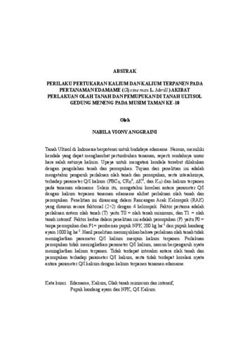 NABILA , VIONY ANGGRAINI (2025) PERILAKU PERTUKARAN KALIUM DAN KALIUM TERPANEN PADA PERTANAMAN EDAMAME (Glycine max L. Merill ) AKIBAT PERLAKUAN OLAH TANAH DAN PEMUPUKAN DI TANAH ULTISOL GEDUNG MENENG PADA MUSIM TAMAN KE-10. FAKULTAS PERTANIAN, UNIVERSITAS LAMPUNG.