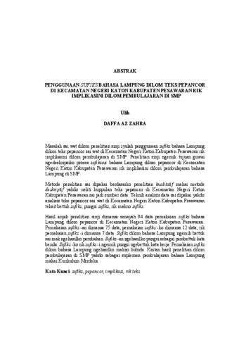 ABSTRAK Masalah sai wat dilom penelitian sinji iyulah penggunaan sufiks bahasa Lampung dilom teks pepancor sai wat di Kecamatan Negeri Katon Kabupaten Pesawaran rik implikasini dilom pembulajaran di SMP. Penelitian sinji ngemik tujuan guwai ngedeskripsiko proses sufiksasi bahasa Lampung dilom pepancor di Kecamatan Negeri Katon Kabupaten Pesawaran rik implikasini dilom pembulajaran bahasa Lampung di SMP. Metode penelitian sai dipakai berdasarko penelitian kualitatif makai metode deskriptif yakdo neliti kuppulan teks pepancor di Kecamatan Negeri Katon Kabupaten Pesawaran sai jadi sumber data. Teknik analisis data sai dipakai yakdo analisis teks pepancor sai wat di Kecamatan Negeri Katon Kabupaten Pesawaran tekait bettuk sufiks, pungsi sufiks, rik makno sufiks. Hasil anjak penelitian sinji dimansa senayah 94 data pemakaian sufiks bahasa Lampung dilom pepancor di Kecamatan Negeri Katon Kabupaten Pesawaran. Pemakaian sufiks -an dimansa 75 data, pemakaian sufiks -ko dimansa 12 data, rik pemakaian sufiks -i dimansa 7 data. Sufiks dilom bahasa Lampung ngemik bettuk sai mak ngehasilko perubahan. Sufiks -an ngehasilko pungsi sebagai pembettuk kata benda. Sufiks -ko rik sufiks -i ngemik pungsi ngebettuk kata kerja. Pemakaian sufiks dilom bahasa Lampung ngehasilko makno bubida. Kaitan hasil penelitian dilom pembulajaran di SMP yakdo sebagai suplemen pembulajaran bahasa Lampung makai Kurikulum Merdeka. Kata Kunci: sufiks, pepancor, implikasi, rik teks Masalah yang terdapat dalam penelitian ini ialah penggunaaan sufiks bahasa Lampung dalam teks pepancor yang terdapat di Kecataman Negeri Katon Kabupaten Pesawaran dan implikasinya dalam pembelajaran di SMP. Penelitian ini memiliki tujuan untuk mendeskripsikan proses sufiksasi bahasa Lampung dalam teks pepancor di Kecamatan Negeri Katon Kabupaten Pesawaran dan implikasinya dalam pembelajaran bahasa Lampung di SMP. Metode penelitian yang digunakan berdasarkan penelitian kualitatif dengan metode deskriptif yaitu meneliti kumpulan teks pepancor di Kecamatan Negeri Katon Kabupaten Pesawaran sebagai sumber data. Teknik analisis data yang dipakai adalah analisis teks pepancor yang terdapat di Kecamatan Negeri Katon Kabupaten Pesawaran terkait bentuk sufiks, fungsi sufiks, dan makna sufiks. Hasil dari penelitian ini ditemukan 94 data pemakaian sufiks bahasa Lampung dalam teks pepancor di Kecamatan Negeri Katon Kabupaten Pesawaran. Setiap bentuk sufiks yang dipakai dalam bahasa Lampung tidak mengalami perubahan. Fungsi dari sufiks -an adalah sebagai pembentuk kata benda, sedangkan fungsi dari sufiks -ko dan sufiks -i sebagai pembentuk kata kerja. Pemakaian sufiks dalam bahasa Lampung menghasilkan makna yang berbeda. Kaitan hasil penelitian terhadap pembelajaran di SMP yaitu sebagai suplemen pembelajaran bahasa Lampung menggunakan Kurikulum Merdeka. Kata Kunci: sufiks, pepancor, implikasi, dan teks ABSTRACT The problem of this research is the use of Lampung language suffixes in pepancor text that available in Negeri Katon District, Pesawaran Regency and its implication in junior high school learning. This research aims to describe the suffixation process of Lampung language in pepancor in Negeri Katon District, Pesawaran Regency and its implication in Lampung language learning in junior high school. The research method used is based on qualitative research with a descriptive approach, focusing on the study of a collection of "pepancor" texts in the Negeri Katon District, Pesawaran Regency, as the data source. The data analysis technique employed is the analysis of "pepancor" texts found in the Negeri Katon District, Pesawaran Regency, related to the forms of suffixes, their functions, and meanings. The results of this study found 94 instances of the use of Lampung language suffixes in "pepancor" texts in the Negeri Katon District, Pesawaran Regency. Each form of the suffix used in the Lampung language remains unchanged. The function of the suffix -an is as a noun-forming element, while the functions of the suffixes -ko and -i are as verb-forming elements. The use of suffixes in the Lampung language produces different meanings. The relationship of the research results to learning in junior high school is as a supplement for Lampung language learning using the Merdeka Curriculum. Keywords: suffix, pepancor, implication , and text